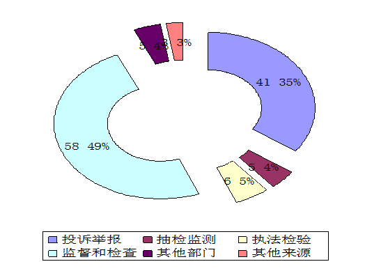 全省各保健食品生产企业许可分布图 二、保健食品案件查处情况(详见附表16) 2016年,全省共查处保健食品案件118件(其中适用简易程序案件18件),涉及物品总值99.29万元,罚款金额185.98万元,没收金额17.64万元,停业整顿2户,取缔(查处)未经许可生产经营1户,捣毁制假售假窝点1个,移交司法机关3件。 从案件来源看,来源于投诉举报的案件41件,来源于抽检监测的案件5件,来源于执法检验的案件6件,来源于日常监督和专项检查的案件58件,来源于其他部门通报的案件5件,其他来源3件。