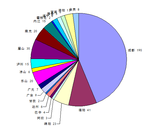 2016年全省保健食品案件来源分布图 从主要违法主体看,以流通单位为主,共12件,其他主体6件。 从案值划分看5万元以下的案件115件,5-20万元的案件1件,20-50万元的1件。 三、保健食品生产、经营企业日常监管情况(详见附表17) 2016年全省各级监管机构共检查保健食品生产企业733家次,检查保健食品品种1379种次,抽检保健食品品种295批次,检出不合格4种次,发现标签标识、说明书与批准内容不一致的4家。 检查保健食品经营企业53435家次,检查企业次数73749家次,抽检保健食品品种批次5920批次,检出不合格保健食品品种76批次,发现标签标识、说明书与批准内容不一致的96家。 第四部分 药品监督管理 一、药品行政受理情况 (一)药品生产企业许可情况(详见附表18) 截至2016年底,全省共核发药品生产许可证412张,原料药和制剂219家,生产原料药企业181家,生产化学药企业181家,生产中药企业(不含饮片)130家,生产中药企业(含饮片)278家。 全省药品生产企业按地区划分,成都:190家;德阳:41家;绵阳:23家;阿坝州:3家;巴中市:4家;达州市:6家;甘孜州:2家;广安市:9家;广元市:7家;乐山市:20家;凉山州:6家;泸州市:15家;眉山市:30家;南充市:20家;内江市:15家;攀枝花市:2家;遂宁市:8家;雅安市:5家;宜宾市:6家;资阳市:13家;自贡市:8家。