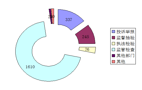 全省药品经营企业情况分布图 二、违法药品案件查处情况(详见附表9) 2017年三季度,各级监管机构共查处违法药品案件总数一般程序案件1101件,简易程序案件1220件,涉及物品总值736.26万元,罚款金额763.47万元,没收金额177.52万元;取缔无证经营4户,捣毁制假售假窝点1个,责令停产停业9户,吊销经营许可证1件,移交司法机关21件。 从案件来源看,投诉举报337件,监督抽验245件,执法检验76件,日常监管和专项检查1610件,其他部门通报23件,其他30件。